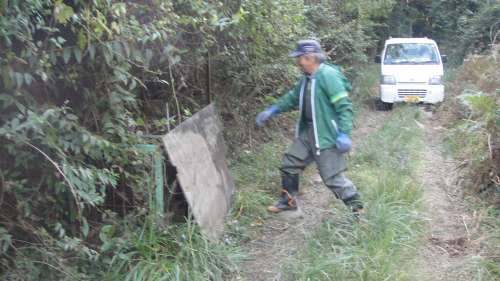 Iさまは、今日はこのホダ木を寫真のように立てる作業のお手伝いをされにKさまのところへ來られたそうで、イノシシがたまたまかかっていたのもあって、ドンコを呼んでくださったそうです