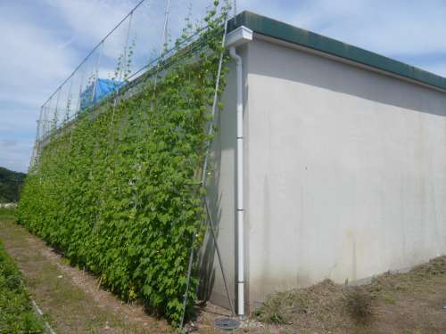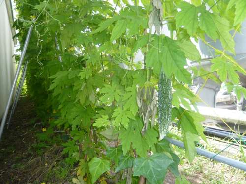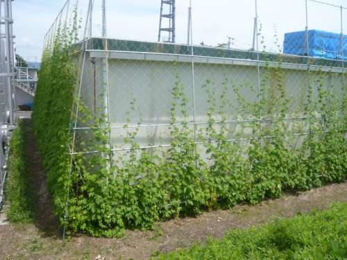 このように施設を植物で覆うことによって、施設への直射日光を避けることができ、それにより施設內溫度もあがらず、エアコンも使用せず、出來た実は食べれてまさに一石三鳥の『グリーンカーテン』です