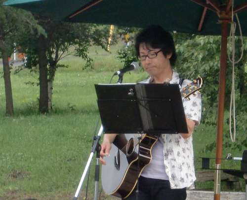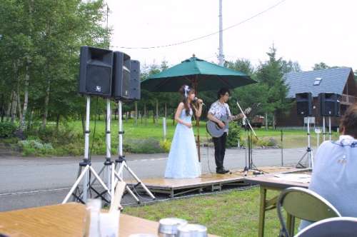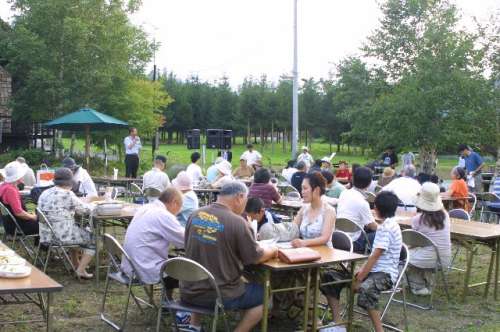さて、サマーコンサートの始まりは午後4時(shí)。會(huì)場(chǎng)の設(shè)営も整い、焼き肉、焼きそばの美味しそうな匂いが一面に漂いはじめる頃には、オーナーの皆さんも続々と集まりはじめました。八幡平ロイヤルホテルに宿泊のオーナーさんも送迎バスで到著です。ほぼ揃った頃合、當(dāng)森林住宅営業(yè)所の司會(huì)でスタートしました。