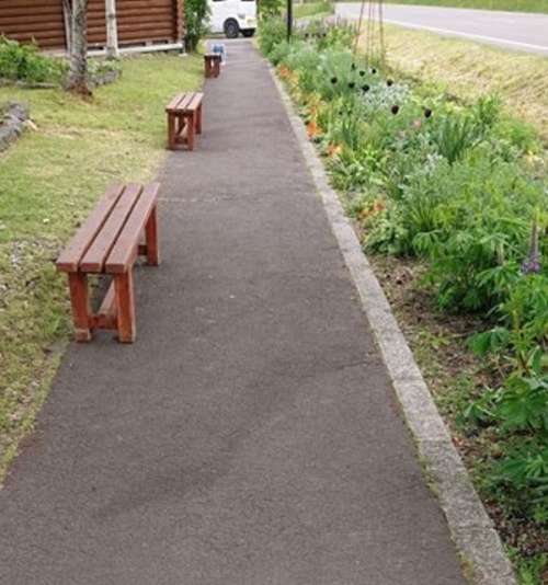 遊歩道にはベンチを設(shè)置して花壇のお花を楽しみながらバスの到著を待つことができます