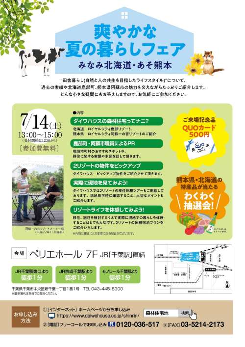 【日 時】 平成30年7月14日(土) 13:00~15:00(受付12:30~) 【場 所】 ペリエホール7F(千葉駅直結) フェアでは北海道鹿部町?熊本県阿蘇市にある森林住宅地のご紹介をさせていただきます 現地の行政擔當者からの話や物件の紹介、體験宿泊のご案內など盛りだくさんの內容となっております 北海道?熊本県の特産品が當たる抽選會もありますよ~ フェアに參加してぜひ北海道の魅力を感じてみてください