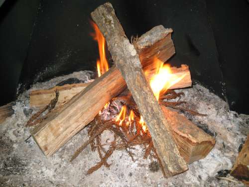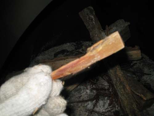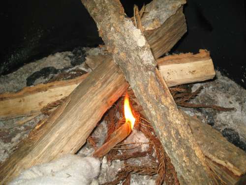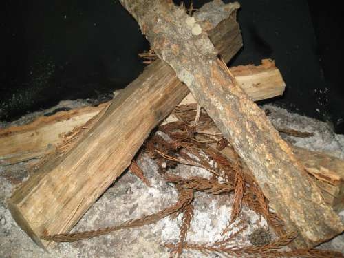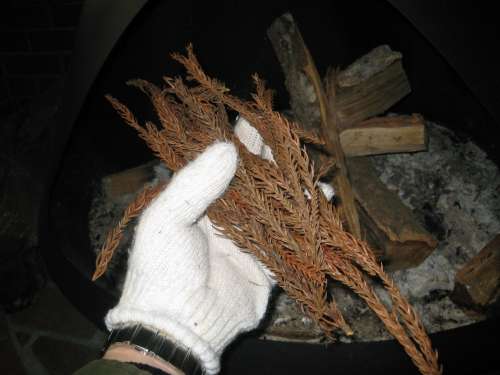 続いて火が薪に燃え移りやすくするため、この枯れた杉の葉を薪の間に入れます。