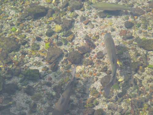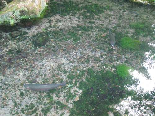泉にはたくさんのニジマス等の魚が、水上ではカモが泳いでおり、とても穏やかな雰囲気が流れております。