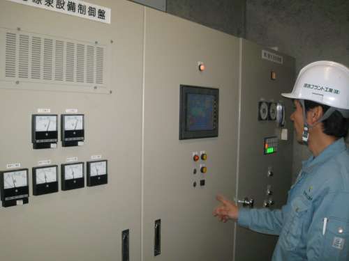 無事にオーナー様のもとへ溫泉を送るために、機械を使って管理をしており、もし機器に異常があれば、寫真のモニターに異常個所が表示されるというすぐれものです。