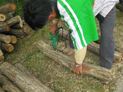 ■數(shù)箇所穴を開けて           ■シイタケの菌を埋め込みます