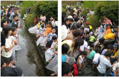 祭りの終盤におこなわれたのは、マスのつかみ取です。