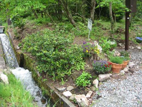 前面道路に水路が流れるこの場所は、水の音が涼しげに聞こえます。