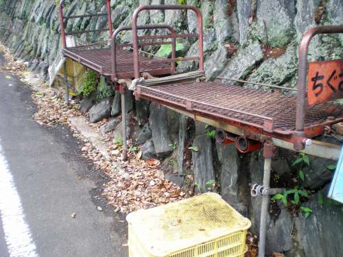 みかん農家には欠かせない、集荷?運搬の必須アイテム。斜面の果樹畑で大活躍の運搬手段。