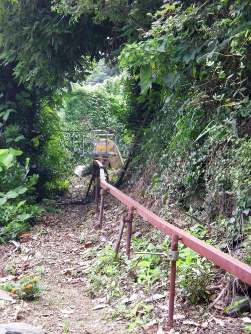 急斜面を一本のレールに沿って上り下りする、小さな貨物列車のようなもので、みかんをいっぱいに入れたキャリ(みかん農家では一般的な言葉のようで、決まった大きさのコンテナ)を積んで動く働き者。
