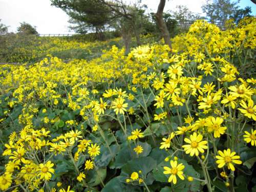 真っ青な空と海の色にツワブキの黃色い花はよく映え、とても美しいものです。