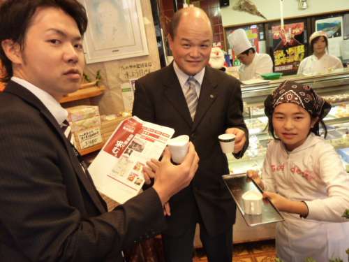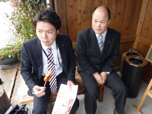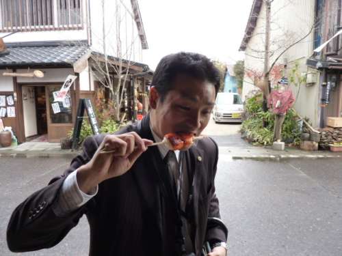 商店街にある漬物屋さん。店の中では阿蘇の野菜を使った數々の漬物が人気。今回はお店の前で店主さんと可愛いお姉ちゃんが売っている真っ赤な『辛辛串だんご』に挑戦。