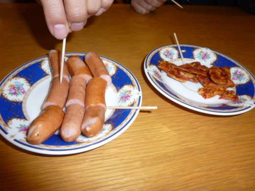 続いて、本日の最後を締めくくる料理『ロシアンウィンナー』と『クレイジーベーコン』を盛り付け、いざ挑戦!!
