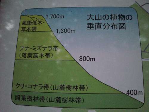 これが植物の垂直分布図 このルートが800m前後ですからクリ?コナラ、ブナ?ミズナラが分布している訳です。