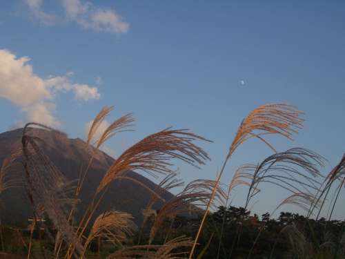 大山とススキと小さな月