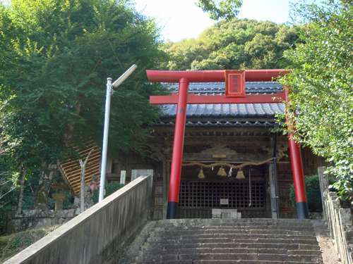 民家の間から続く長い石段の先にある、赤い鳥居がひときわ目を引く