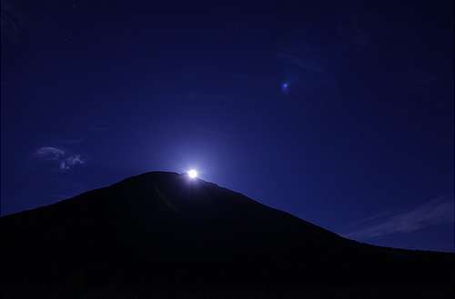 大山の山の綾線に沿って顔を出す満月。 ダイヤモンドムーン。 大山放牧場より。 別荘地より約5.5km 平成23年9月12日撮影