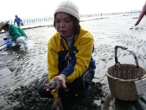 小さな貝(殻長2.5cm以下の稚貝)は持ち帰らず海洋資源保全のため海に戻しましょう(漁業調整規則による)。ジョレンによる貝掘はできません。