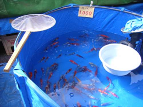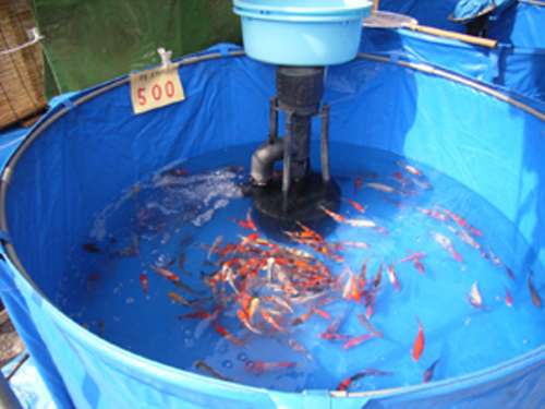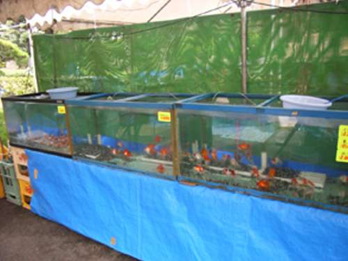 さて、外の植木市の間に、なにやら水槽がたくさん並んでいるので