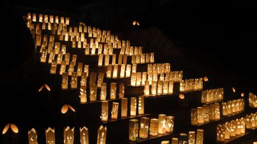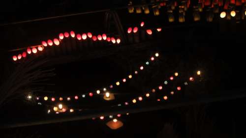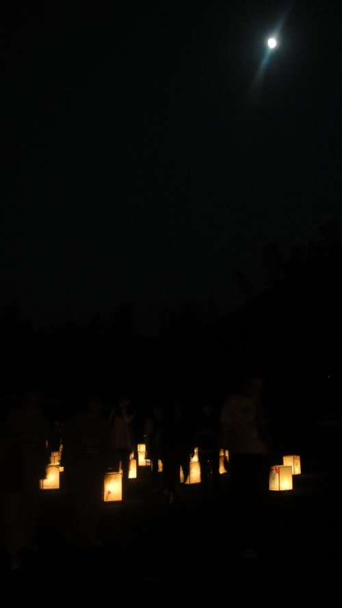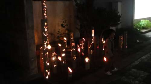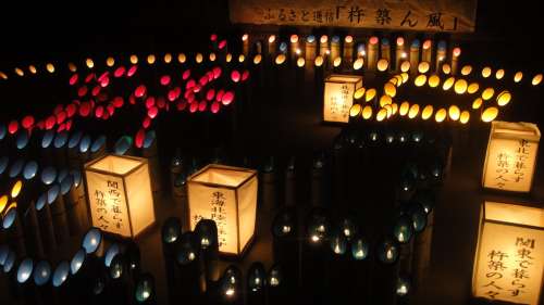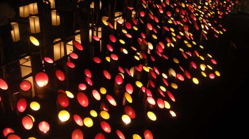 竹の中に色をつけて、中にろうそくを置くとこのようにカラフルな光が生まれます