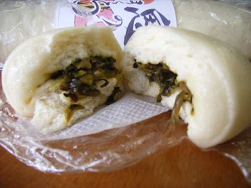 天然酵母で発酵させたまんじゅうの皮で包まれた高菜づけ
