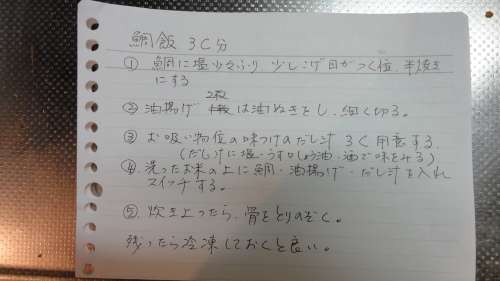 (ゼ)お電話ありがとうございます、杵築リゾート【ゼンゴ】です (オ)あぁ~ゼンゴ君 今日釣りに行ってきたから、帰りがけでも寄っていかない (ゼ)いつもありがとうございます 喜んで伺わせて頂きます ※日常に行われる杵築リゾートの會話です 頂いた魚がこちら 鯛です しかしながら鯛の調理方法がわからないゼンゴ そこでオーナー様が鯛を美味しく頂けるレシピを 頼りは頂いたレシピのみ ここからは男の料理です ※1人暮らしで調理をする 機會も少ない為、多少の 不手際はご了承下さい 用意するものはこちら 鯛にお米に油揚げ シンプルです それでは調理スタート? ①鯛に塩少々ふり、少しこげ目がつく位、半焼きにする 塩をすり込み 半焼きになるまで待ちます 待っている間に次の工程へ ②油揚げ2枚を油ぬきし、細く切る 鍋にお湯を沸かし、 油ぬき後、細く??? こんな感じでしょうか ③お吸い物位の味付けのだし汁3C用意 (だし汁に塩?うすくちしょう油?酒で味をみる) 自宅にある調味料を使い、自身の舌を信じてだし汁完成 鯛の方は いい塩梅じゃないでしょうか ④洗ったお米の上に鯛、油揚げ、だし汁をいれスイッチを入れる 炊飯器は多少小さめですが 何とか炊けそうです 待つ事40分??? ??? ???