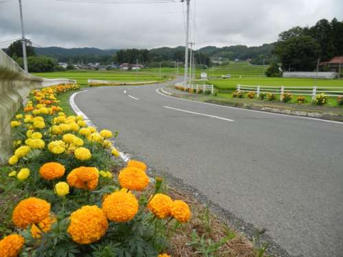 今は八重咲きのマリーゴールドが途切れなく続く「花道」となっています。