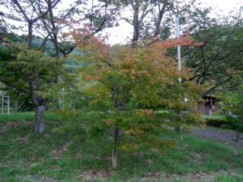 秋へバトンを渡していたのは、モミジでした(;^_^A。うっすらと紅葉が始まっています。