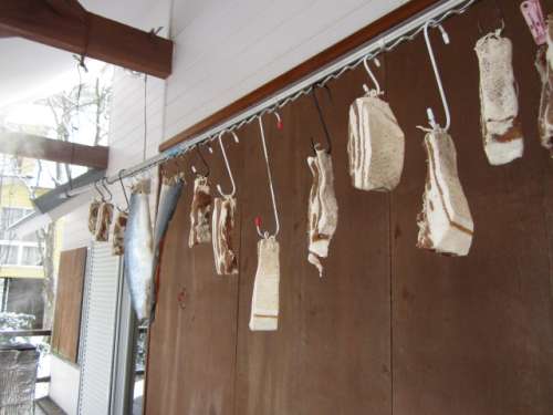 鮭とともにベーコン用の豚バラ肉を干しています。