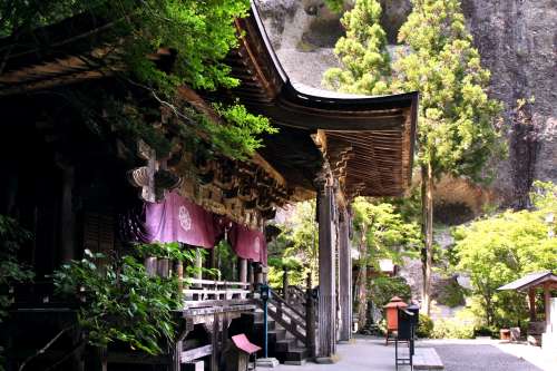 垂直の礫巖峰が本堂を抱きかかえるようにそびえ立ち、
