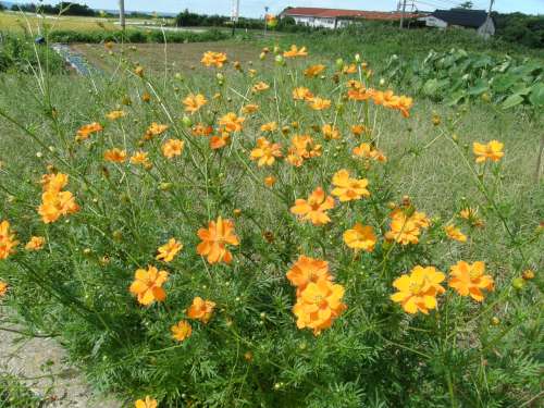 出勤途中、能登志賀の郷リゾートの看板を曲がるとオレンジ色のコスモス