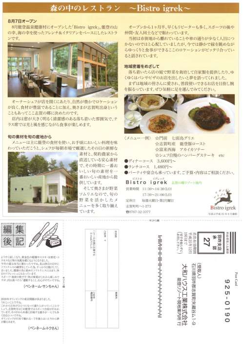 能登志賀の郷リゾート內にOPENした「ビストロ イグレック」、