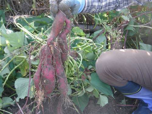 小さい芋を植えておいたら芽が出て、蔓が伸びサツマイモが出來たそうです。