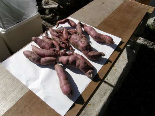 収穫したサツマイモの一部です。焼き芋か天ぷらがいいかな。美味しそう~![]()