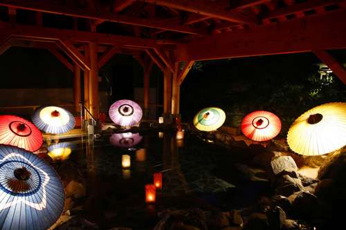 ◎大山の名湯に和傘露天風呂が登場 昨年に秋に誕生した大山の名湯「豪円湯院」。 こちらで人気の露天風呂が、3日間限定で和傘をあしらった露天風呂に大変身。湯船にも絵燈篭が浮かぶなど和の風情たっぷりに名湯気分を満喫できます。