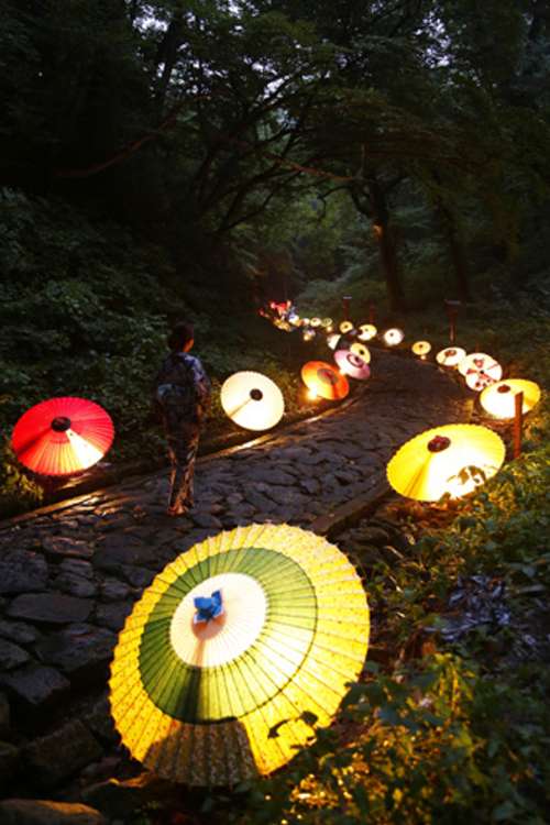 今年はエリアを拡大。 和傘の本數も昨年の40本から2倍となる約80本にグレードアップし、自然石としては日本一の長さを誇る石畳の參道に加え、霊峰大山のシンボルでもある大山寺本堂もライトアップとの事。 様々な仕掛けでみなさんを幽玄の世界へとエスコートいたします。