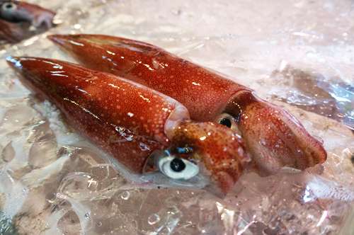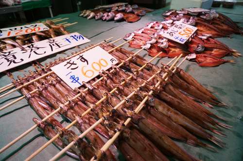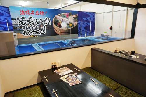 晝前の早い時間ですが何組かお客さんが入っていました。奧には活白いかの水槽がありました。