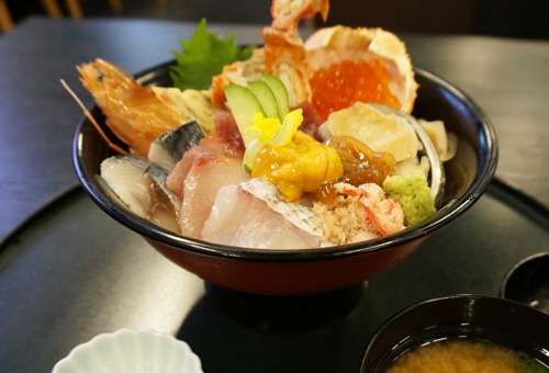 數(shù)分待つとドーンとやってきました。アワビ、うに、鯛、かに、えび。 まるで直売センターがまるごとこの一杯に詰まったような丼です。美味しく頂きました。