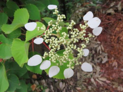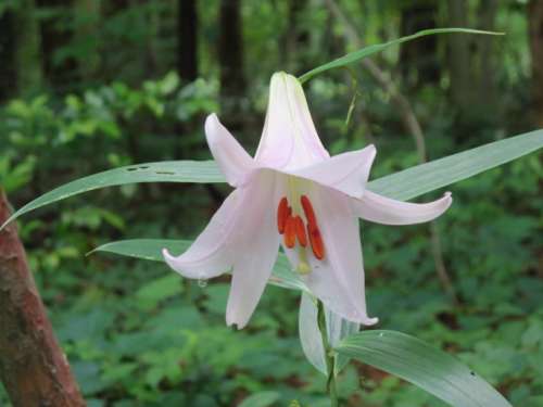 淡いピンク色のササユリ ヤブレガサ ハナイカダ 吾亦紅(われもこう) 船のイカリの形に似た花が咲くイカリソウ ツルアジサイ イワガラミ
