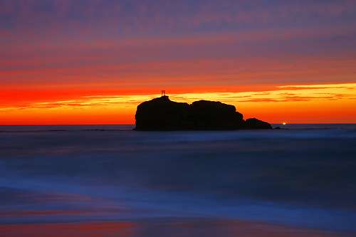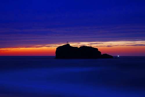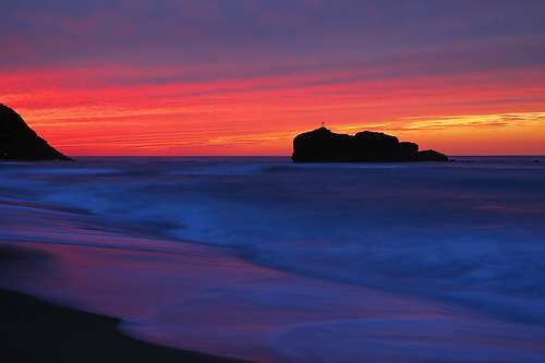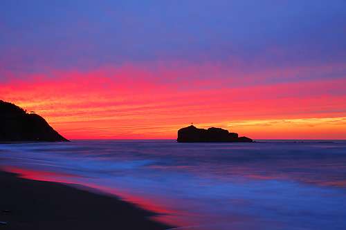鳥取県東部。白兎海岸は出雲神話に登場する因幡の白ウサギ伝説の舞臺。 そんな伝説の浜で、この日の夕方、神秘的なサンセットに遭遇しました。真っ赤に染まった空に浮かぶ鳥居のシルエット。 しばし物語を想いながら、変化する夕景を楽しませてもらいました。