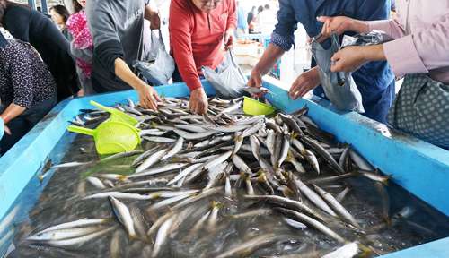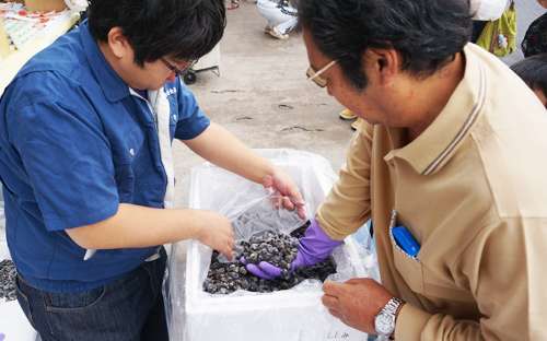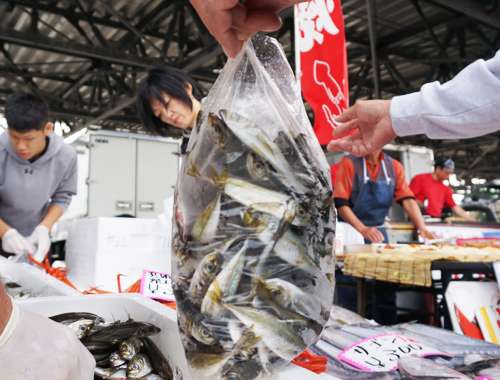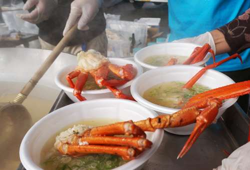 続けてたどり著いた先で向かい合う大人二人。なにか黒いものを握りながらお話をしています。よく見ると宍道湖産冷凍しじみ、なんとつかみどり1回100円だそうです。手が大きい方は有利ですね。 続いて歩いていると魚のいい匂いが漂ってきます。ハタハタの無料試食。美味しそうです。 大勢の人が集まっている一畫を発見。人混みをかき分けたどり著いた先で見たのは、アジ、カマスなど『袋に詰め放題1000円』。 キープ中の袋を撮影。これで1000円とは。それにしても詰まってます。 そしてこれまた豆アジの袋詰め100円。このサイズのアジは南蠻漬けにぴったりですよね。 一番長い列の先にあったもの、それは午前9時(shí)から無料配布される一杯丸ごとのベニズワイガニでした。今年は3000杯が用意されたとのことです。 なんと先頭のご家族は7時(shí)半から待っていたとのことです。 そして列の橫でもくもくと湯気を立てて大釜で茹でられるカニ。これも無料配布のカニ汁です。 その後、マグロの解體ショー、セリ即売體験、乗船體験など企畫が盛りだくさんでした。とにかく新鮮でお得な魚介類が沢山あり、熱狂的なムードに満ちている催しでした。