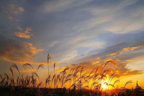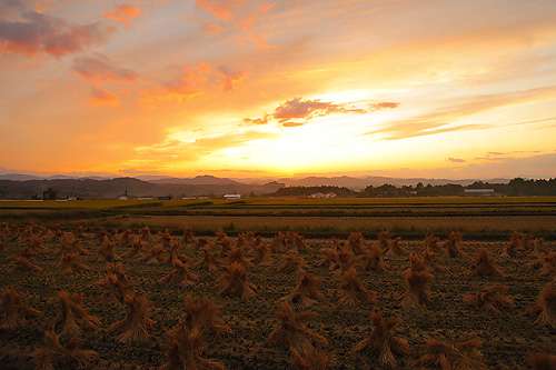 秋のある晴れた夕暮れ時。 大山の中腹へと足を運ぶと、稲刈りの終わった田園風景の夕暮れに遭遇。 赤に染まる空の下、深る秋を実感するシーンがあちこちで垣間見られました。