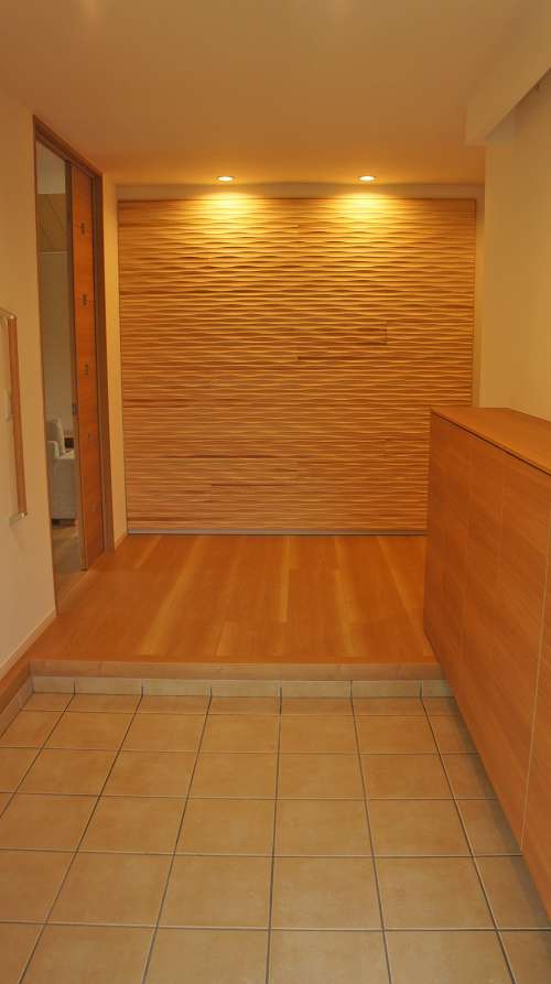 天然木を使った杉ボーダーパネルの化粧壁が迎える玄関