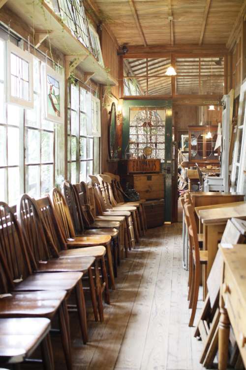 店內には、富澤さんがイギリスで買い付けた200點以上のアンティーク家具やステンドグラスがずらりと並びます。アンティーク家具は、1930〜1940年代にイギリスの一般家庭で使われていたものが中心で、狀態が良いものを厳選して仕入れています。家具に合わせてグラスやガラス瓶、器などの小物がコーディネートされているので、住まいのインテリアの參考になりそうです