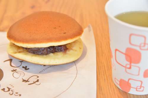 買ったお菓子をその場で食べられるイートインスペースも併設。お茶は無料です。朝に焼いたばかりの「朝焼きどら焼き ひとあわせ」をいただいてみました。もちっとした食感としっとりとした餡がたまりません。