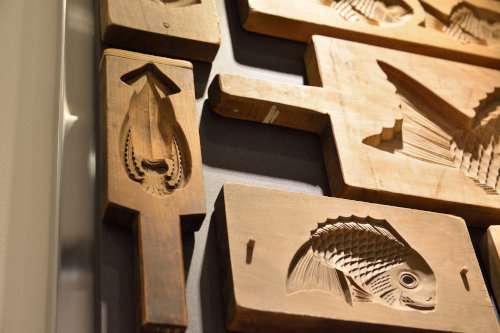 かつて実際に使っていた和菓子の木型を店內のディスプレイに使用しているのがユニーク。函館らしく、イカの木型もありました。