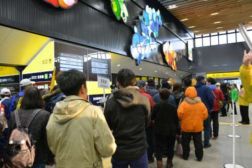 開場してからも、ホームで新幹線を見るためには入場券を求める長い行列に並ばなければなりません。