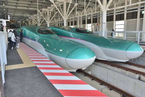 この光景が見られるのは、12時22分から10分少々(目安)のわずかな時間。12時44分に新函館北斗駅を発車する東京行きのH5系が出発待ちの停車をしている間に、東京発のE5系が新函館北斗駅に到著することによって両社の新幹線車両がそろいます。