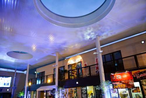 場內では、普段は設置されていないブルー系の照明が燈され、スタイリッシュな雰囲気に。通常は広場となっている建物と建物の間のスペースにイスとテーブルを並べ、ビアガーデンの席としています。
