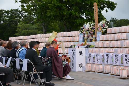 法要が終わり、うっすらと辺りが暗くなってきた頃、明かりを燈した燈ろうがひとつ、またひとつと湖面に浮かべられていきます。一年に一度だけ見ることができる、幻想的な光景です。