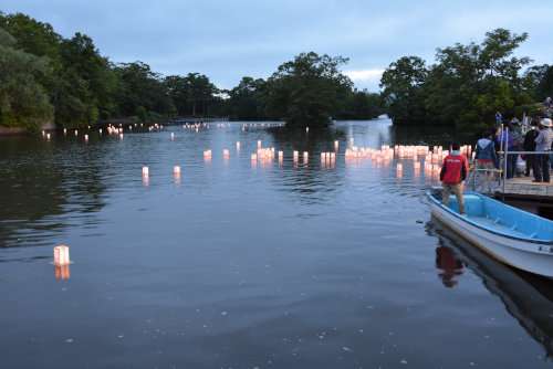 「湖水まつり」を代表する催しのひとつが、燈ろう流し。この一年に亡くなった方や、先祖代々の冥福を祈って、燈ろうを湖に流します。